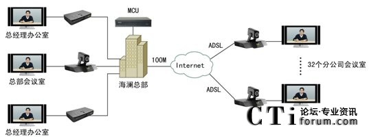2009年6月,領(lǐng)先的視訊廠商科達(dá)攜TrueSens(致勝)視頻會(huì)議系統(tǒng)走進(jìn)海瀾,為海瀾集團(tuán)搭建了一套覆蓋總部2個(gè)領(lǐng)導(dǎo)辦公室、1個(gè)銷售會(huì)議室及全國32個(gè)分公司的視頻會(huì)議系統(tǒng)。整個(gè)方案在部署上非常便捷,海瀾江陰總部的機(jī)房架設(shè)一臺(tái)高、標(biāo)清一體化多點(diǎn)控制單元(MCU),銷售會(huì)議室、集團(tuán)王總、陶總的辦公室以及海瀾集團(tuán)在全國的32個(gè)分公司銷售會(huì)議室則各部署一套視頻會(huì)議終端?偛繋挒100M,分支機(jī)構(gòu)則均通過普通ADSL接入。系統(tǒng)拓?fù)鋱D如下: