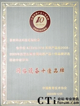 CTI論壇(ctiforum)12月14日消息(記者 張塵):2009年12月4日,由國內(nèi)教育權(quán)威機(jī)構(gòu)“中國教育技術(shù)協(xié)會(huì)”主辦,以讀者調(diào)查問卷的形式舉行的第五屆全國電教產(chǎn)品十佳品牌頒獎(jiǎng)典禮在福州梅峰賓館盛大開幕,科達(dá)教育視頻會(huì)議產(chǎn)品憑借卓越的產(chǎn)品性能和良好的客戶服務(wù)入選網(wǎng)絡(luò)產(chǎn)品類十佳之列,同時(shí)也成為首個(gè)入選十佳品牌的視頻會(huì)議產(chǎn)品。
