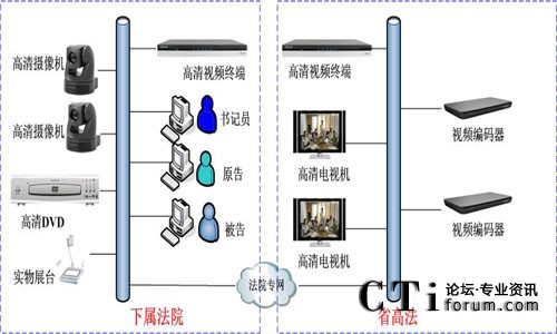 系統(tǒng)覆蓋省高院法庭、8個(gè)地市中院法庭和58個(gè)基層法庭。系統(tǒng)利用法院專(zhuān)用IP傳輸網(wǎng)絡(luò),以省高院各法庭為一級(jí)中心,地市中院為分控中心,基層法院為末端接入。在省高院中心、地市中院和基層分院設(shè)立遠(yuǎn)程數(shù)字庭審中心,配置庭審視頻終端、專(zhuān)用攝像機(jī)和麥克風(fēng),實(shí)現(xiàn)圖像傳輸和遠(yuǎn)程通信。