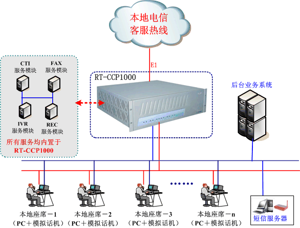 隨著RT-CCP1000呼叫中心系統(tǒng)的順利上線,徹底打破了申銀萬(wàn)國(guó)以往的被動(dòng)服務(wù)模式,將部分被動(dòng)服務(wù)變主動(dòng)服務(wù)模式同時(shí),在融天科技的指導(dǎo)下,將外呼服務(wù)、傳真服務(wù)、留言信箱、短信功能以及外呼模塊有效的結(jié)合起來(lái),同時(shí)整合申銀萬(wàn)國(guó)的各項(xiàng)資源進(jìn)行了客戶資源挖掘,為申銀萬(wàn)國(guó)產(chǎn)生了巨大的商業(yè)價(jià)值,RT-CCP1000呼叫中心系統(tǒng)從為客戶提供服務(wù)變?yōu)榱酥苯赢a(chǎn)生利潤(rùn)呼叫中心系統(tǒng),目前已經(jīng)被申銀萬(wàn)國(guó)當(dāng)作了業(yè)務(wù)轉(zhuǎn)型、創(chuàng)新亮點(diǎn)、爭(zhēng)奪客戶資源、體現(xiàn)企業(yè)實(shí)力的重要手段。統(tǒng)組網(wǎng)大致如下: