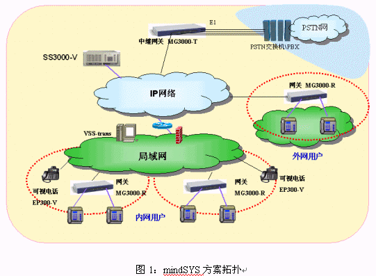 mindSYS方案通過數(shù)字中繼或者模擬中繼與電信運(yùn)營商的程控交換機(jī)連接,無縫的接入PSTN網(wǎng)絡(luò),使得VOIP與傳統(tǒng)的電話、手機(jī)隨時(shí)互通,網(wǎng)內(nèi)網(wǎng)外同樣打電話,溝通世界的每一個(gè)角落。