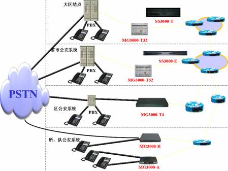 在各省地市公安網(wǎng)絡(luò)中心配置語音服務(wù)器SS3000-E和中繼媒體網(wǎng)關(guān)MG3000-T32, MG3000-T32通過10/100Base-T以太網(wǎng)接口連接IP網(wǎng)絡(luò),支持多路并發(fā)的語音呼叫,在提供數(shù)據(jù)接入的同時,成功的實現(xiàn)各級單位的語音業(yè)務(wù)的接入以及享受系統(tǒng)提供多種增值業(yè)務(wù),以滿足最終電話用戶的需求。