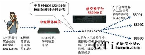 400業(yè)務(wù)又稱“主被叫分?jǐn)偢顿M(fèi)業(yè)務(wù)”,即為客戶提供一個(gè)全國范圍的400號(hào)碼,并把對(duì)該號(hào)碼的呼叫接至被叫客戶事先規(guī)定目的地(電話號(hào)碼或呼叫中心)。通常是主叫(撥打400的人)付市話費(fèi),被叫(擁有400號(hào)碼的客戶)付長途費(fèi)(主叫地區(qū)到目的地之間)SS3000-E適時(shí)推出了支持400業(yè)務(wù)的功能,即“被叫計(jì)費(fèi)”。按照下圖的指示,利用SS3000-E的被叫計(jì)費(fèi)功能,本次通話的費(fèi)用部分計(jì)在了4008123456這個(gè)號(hào)碼上。