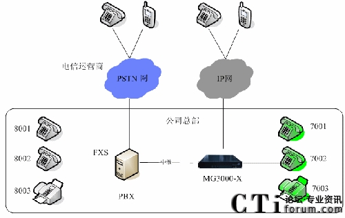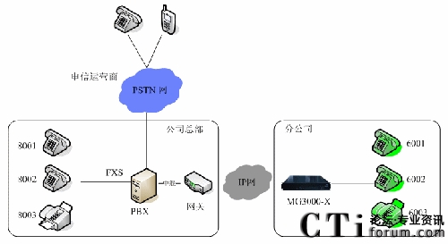 公司總部增加一臺語音網(wǎng)關,通過中繼線與原有的PBX相連,異地分公司增加一臺IPPBX,下面開通分機,公司總部和分公司通過IP網(wǎng)連接在了一起。