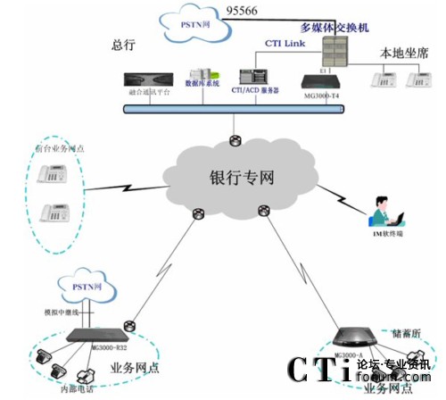 本設(shè)計方案在內(nèi)蒙中行總部的專網(wǎng)配置統(tǒng)一的控制管理平臺用于對下面各網(wǎng)點終端的統(tǒng)一控制管理,另外配置多E1 IP數(shù)字中繼網(wǎng)關(guān)和中行內(nèi)部的電話銀行交換機對接,實現(xiàn)IP話路和中行的電話銀行系統(tǒng)的互聯(lián)。下面各網(wǎng)點、理財中心部署IP專線電話終端,用于銀行客戶在各營業(yè)網(wǎng)點拿起話筒就自動自動撥號,通過銀行專網(wǎng)進入電話銀行系統(tǒng)進行語音互動。