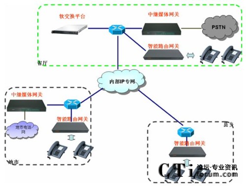 通過(guò)上述三環(huán)節(jié),即在財(cái)政內(nèi)部網(wǎng)上建立了一套跨區(qū)域的電話系統(tǒng)。拓?fù)涫疽鈭D如下: