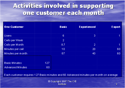 圖表2說(shuō)明了我們?nèi)绾问褂眠@些數(shù)字去計(jì)算基礎(chǔ)和高級(jí)技術(shù)支持需要為每個(gè)客戶每月所花的通話時(shí)長(zhǎng)。由于初級(jí)和有經(jīng)驗(yàn)的客戶使用者可以由基礎(chǔ)技術(shù)座席支持,所以基礎(chǔ)技術(shù)支持座席每月所接電話為87+40=127分鐘,高級(jí)技術(shù)支持座席每月所接電話為60分鐘。