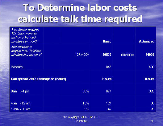根據(jù)圖表12,我們可以算出第二種方式的利潤(rùn)百分比。如果我們假設(shè)每個(gè)客戶每年的收入是20,000美元,其中分配給呼叫中心部門(mén)的收入是20%。我們每個(gè)客戶每月的收入是333.33美元,每個(gè)客戶月的成本是223.88美元(參見(jiàn)圖表10)。這導(dǎo)致我們來(lái)自每個(gè)客戶每月的利潤(rùn)是109.46美元——這將產(chǎn)生33%的利潤(rùn)率。