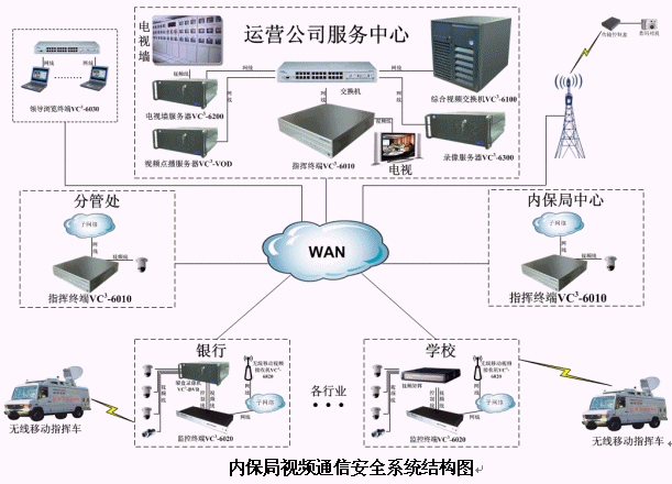 針對(duì)以上情況,北京華緯訊電信技術(shù)有限公司基于最新推出的VC3-6000綜合視頻通信平臺(tái)提出了針對(duì)性的"城市安保聯(lián)動(dòng)視頻通信平臺(tái)"解決方案。該平臺(tái)整合多種資源,實(shí)現(xiàn)了視頻指揮調(diào)度、遠(yuǎn)程視頻監(jiān)控、視頻會(huì)議、視頻點(diǎn)播、無線移動(dòng)視頻接入、高清晰圖片傳輸和環(huán)境監(jiān)測等功能。平臺(tái)組成如下圖: