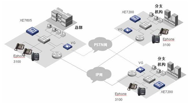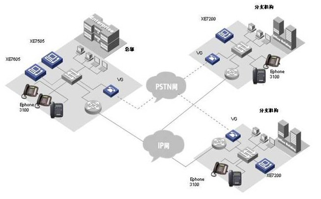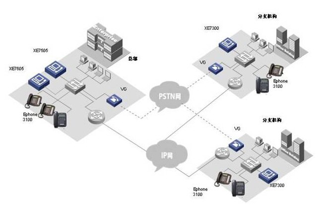 各小分支機構的IP語音終端可以直接注冊到本地XE 7000上, 從而實現(xiàn)整網(wǎng)的分布式部署。