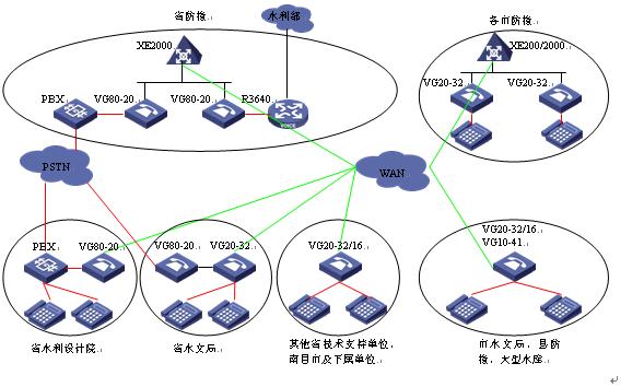 省水利設(shè)計(jì)院已經(jīng)部署了200門(mén)容量的PBX,采用語(yǔ)音網(wǎng)關(guān)將PBX及其下掛的模擬電話接入系統(tǒng)后,除了不需要連接水利部語(yǔ)音系統(tǒng)外,其組網(wǎng)與省防總完全一致,與省水利設(shè)計(jì)院連接的PBX可采用VG80-20,使用2個(gè)E1連接。
