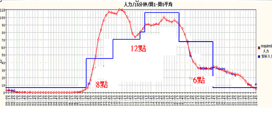 大家看到圖一中紅色的線,就是一天里面電話進(jìn)來的數(shù)量,藍(lán)色的線是安排的人力。可以清楚看到:早上8點(diǎn)一開始,電話就一直進(jìn)來;中午來電的客戶開始去吃飯,電話就開始下滑;然后等到客戶吃完中飯,電話又開始進(jìn)來,下午又出現(xiàn)另外一個(gè)高峰;一直到5點(diǎn)以后又開始下滑,6點(diǎn)以后電話相對(duì)就少很多。