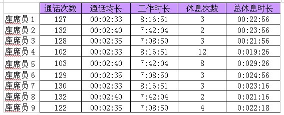 上面這張表格,畫出的就是9個座席員的話務(wù)數(shù)據(jù)情況,分別列出了通話次數(shù)、通話均長、工作時長、休息次數(shù)、總休息時長這五個KPI指標(biāo),你可以看的出來是哪一個座席員在呼攸嗎?