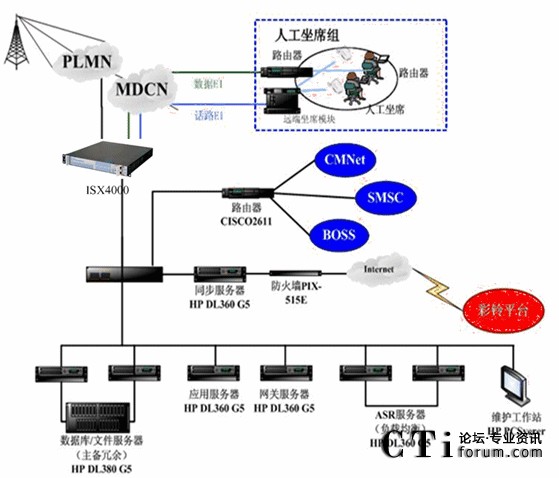 平臺(tái)核心話路接入集在中毅航通信iSX4000智能業(yè)務(wù)交換機(jī)的IVR自動(dòng)語(yǔ)音平臺(tái),人工坐席平臺(tái)通過(guò)和系統(tǒng)支撐軟件實(shí)現(xiàn)遠(yuǎn)端坐席功能,通過(guò)專線中繼與IVR平臺(tái)實(shí)現(xiàn)話路連接;InterNet與IVR平臺(tái)實(shí)現(xiàn)數(shù)據(jù)同步。根據(jù)移動(dòng)交換網(wǎng)傳輸內(nèi)容選擇應(yīng)相的IVR自動(dòng)語(yǔ)音服務(wù)或人工坐席服務(wù)。