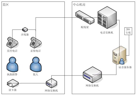 親情電話管理系統(tǒng)在系統(tǒng)設(shè)計(jì)中充分考慮監(jiān)獄的需求與特點(diǎn),不但包含了一般親情電話錄音所需的全部功能,而且還融合了獄政管理的功能,整個(gè)系統(tǒng)采用集中式方式,在中心機(jī)房部署一套親情電話錄音服務(wù)器,各個(gè)監(jiān)區(qū)監(jiān)控系統(tǒng)利用監(jiān)獄內(nèi)部的局域網(wǎng)聯(lián)結(jié)成一個(gè)整體,形成一個(gè)能監(jiān)控監(jiān)獄親情電話的全網(wǎng)。這樣即可以在每個(gè)監(jiān)區(qū)監(jiān)聽,也可以在監(jiān)獄內(nèi)部網(wǎng)的任何地方對(duì)親情電話進(jìn)行全程監(jiān)視。該系統(tǒng)能夠完全滿足目前監(jiān)獄的需求,產(chǎn)品性價(jià)比遠(yuǎn)遠(yuǎn)高于市場(chǎng)上其他同類產(chǎn)品。