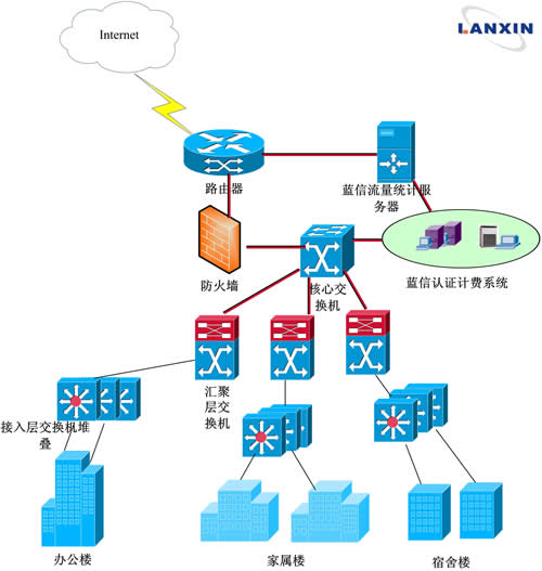 在學(xué)校的網(wǎng)絡(luò)中心部署藍信認證計費系統(tǒng),負責(zé)對用戶的集中統(tǒng)一管理;此外,在網(wǎng)絡(luò)的出口處部署藍信流量統(tǒng)計工具,負責(zé)對所有流量進行采集,網(wǎng)管者通過客戶端實現(xiàn)對用戶的管理和控制。