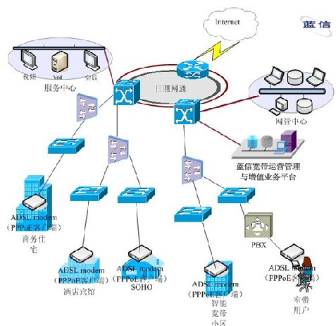 在以以太網(wǎng)技術(shù)為主建設(shè)的運營區(qū)域,在中心由一臺模塊化的核心交換機支持,輔以多臺BASE設(shè)備連接,在接入層用交換機做接入設(shè)備,保證用戶數(shù)據(jù)的快速傳播。在網(wǎng)絡(luò)核心處,部署信利公司的藍信寬帶認證計費系統(tǒng),負責對全網(wǎng)用戶的安全認證、計費及管理。藍信寬帶認證計費系統(tǒng)除支持標準的RADIUS協(xié)議外,還支持PPPoE、802.1x認證。在用戶終端處,部署藍信特制的PPPoE客戶端,實現(xiàn)撥號上網(wǎng)。