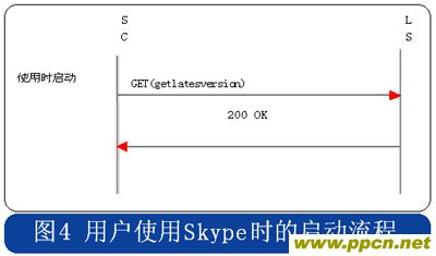 Skype的用戶終端啟動(dòng)時(shí),采用HTTP協(xié)議連接到注冊(cè)服務(wù)器,用戶初次安裝的啟動(dòng)流程中攜帶“installed”的參數(shù),使用時(shí)啟動(dòng)流程則在消息中攜帶“getlatestversion”參數(shù),具體流程分別見圖3和圖4。
