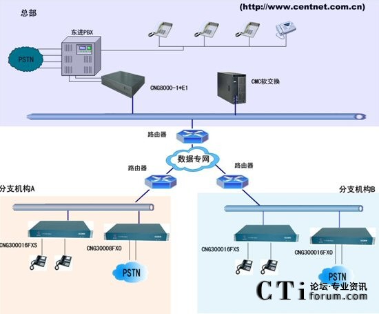 方案組網(wǎng)說明:通過呼叫中心服務(wù)器E1接口聯(lián)系數(shù)字中繼CNG8000-1*E1, 遠(yuǎn)程座席接CNG3000FXS ,遠(yuǎn)程PSTN接CNG3000FXO設(shè)備,上述設(shè)備統(tǒng)一注冊(cè)到CMC軟交換上。