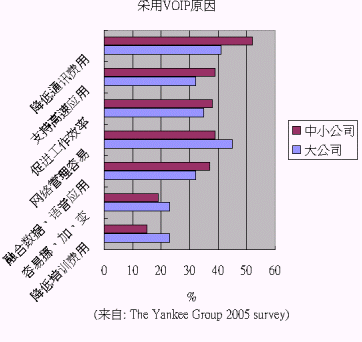 根據(jù)美國著名的咨詢公司 The Yankee Group 2005 年的調(diào)研各企業(yè)使用VOIP的原因,大企業(yè)與中小企業(yè)略有差異:大企業(yè)認(rèn)為網(wǎng)絡(luò)管理、省錢、促進工作效率為最關(guān)鍵的三個原因;中小企業(yè)則認(rèn)為省錢、網(wǎng)絡(luò)管理容易、支持高速應(yīng)用、促進工作效率為主要原因。