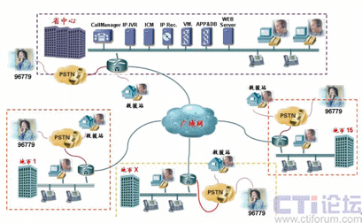 如上圖所示,由于Cisco IPCC是基于標(biāo)準(zhǔn)IP網(wǎng)絡(luò)的純IP呼叫中心解決方案,呼叫中心的核心設(shè)備都只部署在省中心機(jī)房,其它地市只需要在原有網(wǎng)絡(luò)的路由器上添加語音模塊即可實現(xiàn)PSTN語音的本地接入,而無需再各地市購買額外的接入設(shè)備。而同樣由于IP網(wǎng)絡(luò)的特性,呼叫中心的坐席可以根據(jù)需要部署在甘肅省運(yùn)輸管理局IP網(wǎng)絡(luò)可達(dá)的任何一個地方,各地市的坐席只需要配備IP電話和座席PC即可。來自PSTN的電話根據(jù)用戶在IVR中的選擇和其它路由策略,自動分配到最適合的坐席處理,譬如來自白銀的運(yùn)政投訴由白銀市本地的運(yùn)政大廳座席人員處理。