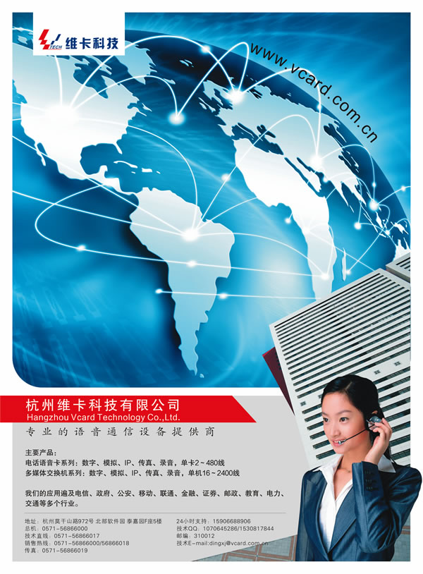 維卡科技有限公司(簡(jiǎn)稱“維卡科技”)成立于2004年,是一家以下一代網(wǎng)絡(luò)通信為發(fā)展方向的高科技企業(yè),公司成立于上海,在杭州設(shè)立研發(fā)和生產(chǎn)基地,公司主要從事通信和語(yǔ)音產(chǎn)品的研究、開發(fā)、生產(chǎn)及銷售,是國(guó)內(nèi)通信語(yǔ)音產(chǎn)品―――電話語(yǔ)音卡的核心供應(yīng)商之一。公司匯集一批多年從事CTI技術(shù)研究的高級(jí)專業(yè)人才,堅(jiān)持自主創(chuàng)新,自主研發(fā),不斷推出適合人性化的一流產(chǎn)品,經(jīng)過短短幾年的發(fā)展,公司的語(yǔ)音卡產(chǎn)品已經(jīng)躋身全國(guó)三強(qiáng),為中國(guó)的CTI行業(yè)貢獻(xiàn)了一份力量。