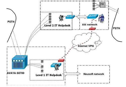 實(shí)施中,A公司的IT Helpdesk服務(wù)熱線號(hào)碼直接路由至東軟呼叫中心平臺(tái),Level 1座席用東軟呼叫中心的分機(jī)提供在線服務(wù);Level 2座席的物理位置在A公司,電話分機(jī)通過(guò)專線連接至東軟呼叫中心的PBX上。