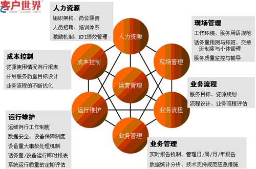 我們都知道,呼叫中心的運營管理,有諸多要素組成,一般以為,分為如下六種,如圖: