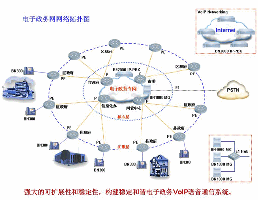 MG和BN2000 IP PBX就可以利用電子政務(wù)網(wǎng)自身的優(yōu)勢(shì),實(shí)現(xiàn)VoIP語(yǔ)音通信。電子政務(wù)網(wǎng)內(nèi)的所有IP電話用戶統(tǒng)一在核心層的BN2000