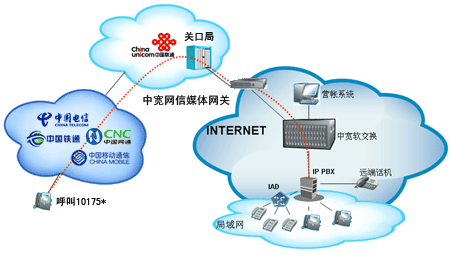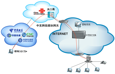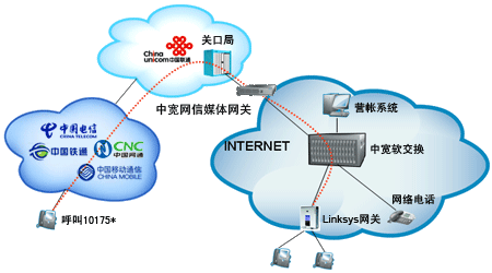 企業(yè)或個人自行從網(wǎng)站上成功申請“企業(yè)商務(wù)通”或“個人隨身行”業(yè)務(wù)后,通過101756*全國統(tǒng)一接入號結(jié)合中寬網(wǎng)信推薦的思科linksys網(wǎng)關(guān)或網(wǎng)絡(luò)電話使用,當(dāng)外部對您申請的10175*號碼發(fā)起呼叫時,該呼叫通過中國聯(lián)通的線路將話務(wù)指向中寬網(wǎng)信的媒體網(wǎng)關(guān),由中寬軟交換平臺將呼叫送至您指定的電話上。另外,當(dāng)您使用該業(yè)務(wù)外呼時,可以選擇在被叫電話上顯示10175*或隱藏號碼。