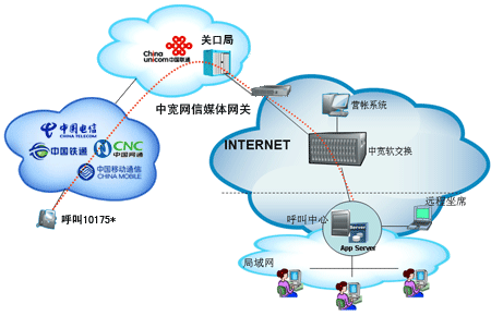 企業(yè)自行從網(wǎng)站上成功申請“企業(yè)商務(wù)通”業(yè)務(wù)后,通過101756*全國統(tǒng)一接入號結(jié)合呼叫中心,當(dāng)外部對企業(yè)申請的10175*號碼發(fā)起呼叫時,該呼叫通過中國聯(lián)通的線路將話務(wù)指向中寬網(wǎng)信的媒體網(wǎng)關(guān),由中寬軟交換平臺將呼叫送至指定的呼叫中心,由呼叫中心完成相應(yīng)的服務(wù)。另外,當(dāng)您使用該業(yè)務(wù)外呼時,可以選擇在被叫電話上顯示10175*或隱藏號碼。