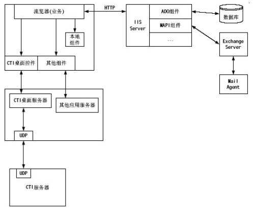 對(duì)于所有的電力業(yè)務(wù)模塊都是在IE瀏覽器上實(shí)現(xiàn),瀏覽器上的應(yīng)用模塊對(duì)WEB Server發(fā)出請(qǐng)求,WEB Server解釋運(yùn)行ASP程序,利用ASP創(chuàng)建數(shù)據(jù)庫(kù)組件訪問(wèn)系統(tǒng)的數(shù)據(jù)庫(kù)信息;利用嵌入WEB頁(yè)面的CTI桌面控件可以實(shí)現(xiàn)CTI集成功能,如:建立呼叫、應(yīng)答呼叫、席間轉(zhuǎn)移、人工自動(dòng)切換等等;利用其他嵌入WEB網(wǎng)頁(yè)的組件實(shí)現(xiàn)其他擴(kuò)展功能,如:Exchange Server服務(wù)等。