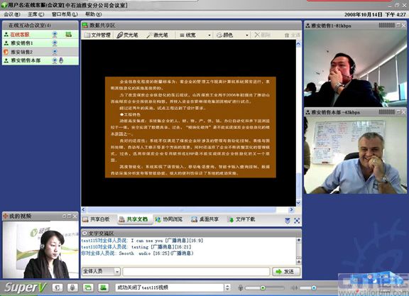 CTI論壇(ctiforum)05月19日消息: 自08年攜手視維Super-V視頻會議以來,中石油雅安分公司銷售部的日常工作會議高效及時地開展,尤其是在5.12四川大地震后,工作不但沒有中斷,而且足不出戶就可以給上級領導匯報工作,與同事交流營銷心得。而在以前,只能通過電話或者郵件,甚至長途跋涉聚集到一個地方舉行會議,既浪費時間又增加營銷成本。這是繼中國重汽、新加坡協(xié)美集團等跨國集團公司倡導信息時代新營銷主義,實現高效運營的又一典型案例應用。