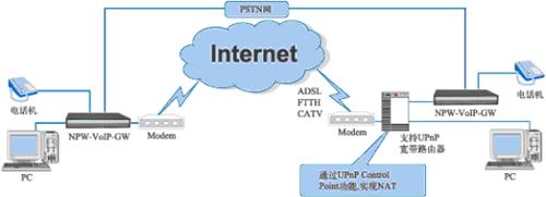 NPW-VoIP-GW作為客戶端VoIP網(wǎng)關(guān)置于各個(gè)企業(yè)分支機(jī)構(gòu)或家庭用戶桌面。其WAN接口可以連接各類(lèi)同步modem以PPP方式或使用以太網(wǎng)口接入公網(wǎng)。同時(shí)NPW-VoIP-GW上的FXO接口可以連接PBX接入PSTN網(wǎng)絡(luò)實(shí)現(xiàn)備份功能。如圖所示NPW-VoIP-GW上連接的話機(jī)可以直接通過(guò)Internet或PSTN撥打?qū)Ψ健?br />