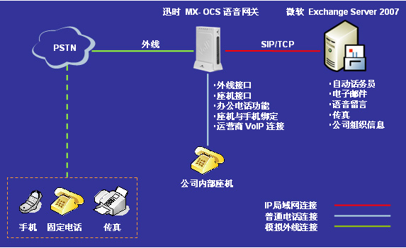 迅時通信針對微軟統(tǒng)一溝通解決方案,在2008年推出了MX-OCS系列辦公型VoIP語音網(wǎng)關(guān)。將微軟Exchange Server 2007 統(tǒng)一消息服務器與迅時通信MX-OCS網(wǎng)關(guān)集成而構(gòu)成的解決方案(簡稱“1+1”方案),能大幅降低中小企業(yè)擁有統(tǒng)一溝通平臺的成本。