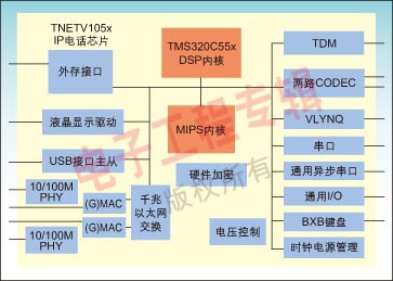 TNETV1050芯片包含一個(gè)內(nèi)置的以太網(wǎng)交換機(jī)以及雙PHY,可以在桌面上提供IP電話服務(wù)的同時(shí),提供一個(gè)PC連接。TNETV1050的USB接口可以使IP電話連接多種USB設(shè)備,如PDA等。設(shè)計(jì)者還可以通過(guò)TI的VLYNQ接口擴(kuò)展多種其他功能,例如Wi-Fi模塊,硬件加密等。芯片集成了LCD控制器、CODEC以及鍵盤接口,降低了系統(tǒng)成本。
