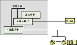 在傳統(tǒng)的語音卡設(shè)計中,一些語音卡廠商采用一體化設(shè)計,根據(jù)功能的要求,采用通用的分離元件和集成電路自行設(shè)計電路。采用該類設(shè)計的語音卡板卡的通道類型、功能、通道數(shù)量在設(shè)計之初已決定,因而靈活性較差,在構(gòu)成CTI系統(tǒng)時會造成通道資源的浪費。圖1展示了用此類板卡如何構(gòu)筑一個8外線+3座席的CTI系統(tǒng),當(dāng)用戶需要增加一個外線通道時,就需另增加一塊外線卡,投資較大。