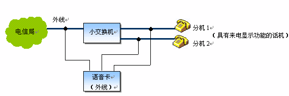 說明:將語音卡的外線通道并接在小交換機的全部內(nèi)外線端口上,在軟件的控制下,不僅可以將外線來電號碼轉(zhuǎn)發(fā)至分機,并且還可以在內(nèi)線通話時,看到通話對方的號碼,非常實用。當(dāng)然,如果直接采用語音卡(外線+座席)來構(gòu)成小交換機,則系統(tǒng)更為簡潔,成本也大為降低。