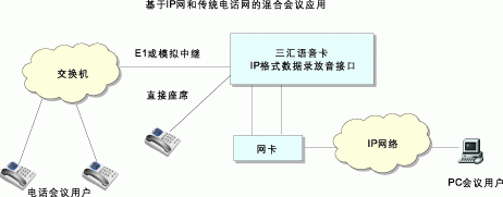 交互式電話會議與傳統(tǒng)的電話會議的區(qū)別就在于開會時不需要由會議主持人控制由某人發(fā)言,而是所有與會者可以自由發(fā)言,就如同坐在同一間會議室中一樣。三匯公司所有型號的基于DSP技術(shù)的語音卡,包括數(shù)字卡和模擬卡,均內(nèi)置了對交互式電話會議的支持,只要使用語音卡,無需額外的會議卡,就可以構(gòu)成具有完善功能的交互式電話會議系統(tǒng)。三匯公司還采用了獨創(chuàng)的分布式電話會議實現(xiàn)技術(shù),電話會議的關(guān)鍵資源----混音器分布在每一個通道中。因此語音卡對會議系統(tǒng)的支持具有極大的靈活性,既可以召開大量的三方會議,也可召開所有通道同時參加的大型會議,無論是會議的數(shù)量還是參加會議的人數(shù)均只受系統(tǒng)總通道數(shù)的限制。三匯語音卡還支持IP會議和傳統(tǒng)電話會議的混合應用。