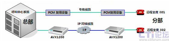 傲威通信采用AVX1200作為中心端和遠程坐席端的復接設備,采用Hotline形式,只要遠程坐席員摘機,中心端的呼叫中心交換機立刻接到摘機指令。當有呼叫到來,遠程坐席可像本地坐席一樣接聽電話,無任何差異。