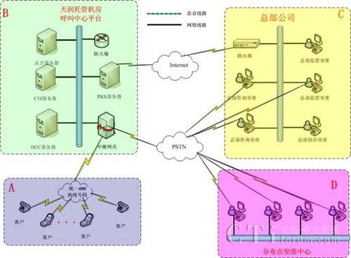 方案一:400電話(huà)+托管呼叫中心平臺(tái)+坐席分布在總部和分布點(diǎn)