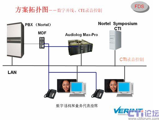 Audiolog錄音系統(tǒng)能和Nortel交換機(jī)、Symposium CTI進(jìn)行整合,獲取CTI隨路數(shù)據(jù)便于用戶錄音資料檢索。
