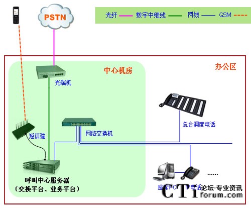 維佳元?jiǎng)?chuàng)呼叫中心系統(tǒng)采用暢信達(dá)通信呼叫中心交換平臺(tái)與業(yè)務(wù)平臺(tái),采用1路E1數(shù)字中繼線接入,對外公布一個(gè)400號(hào)碼與10多個(gè)辦公電話號(hào)碼,采用IP話機(jī)作為總臺(tái)調(diào)度電話、座席電話與辦公電話,系統(tǒng)架構(gòu)形式如下: