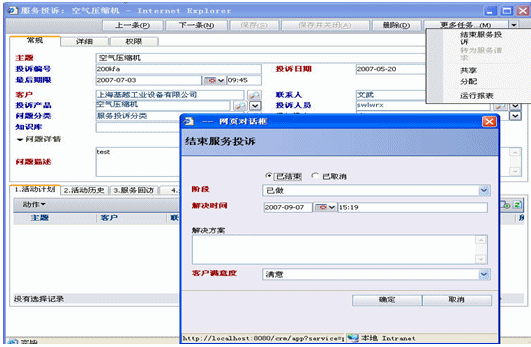 服務投訴,公司服務投訴由前臺接收然后轉交工程服務人員受理即是由工程服務部經理審核通過后轉為服務請求,從而生成派工單提交總經理處審批.