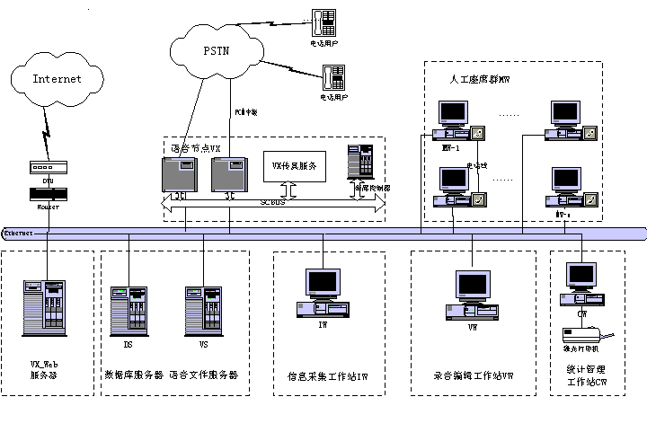客戶服務中心系統(tǒng)包含智能排隊機(含接入服務器)、核心服務器CCS、交互式語音應答系統(tǒng)IVR、語音傳真服務器、業(yè)務服務器、工作流服務器、數據庫服務器、Internet/Intranet服務器、人工座席、尋呼機接口,手機短消息接口等組成。如下圖所示為Runsun呼叫中心系統(tǒng)結構圖: