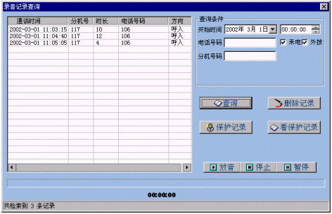 根據(jù)該操作員的類別判定該操作員具有那些權(quán)限(查詢、管理、監(jiān)聽等),具備查詢權(quán)限的操作員可以按時(shí)間、分機(jī)號(hào)、來去點(diǎn)號(hào)碼等來查詢所有的錄音信息;具備管理權(quán)限的操作員可以進(jìn)行操作員管理以及對(duì)系統(tǒng)相關(guān)參數(shù)的設(shè)置;具備監(jiān)聽權(quán)限的操作員可以監(jiān)聽其他坐席的實(shí)時(shí)狀態(tài)。