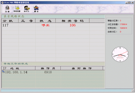 錄音坐席為網(wǎng)音公司開發(fā)的基于3Com NBX wavphone的軟件電話,與pcXset功能基本相同,能實(shí)現(xiàn)外撥、應(yīng)答、掛機(jī)、電話會(huì)議、呼叫轉(zhuǎn)移、呼叫保持等常用功能。
