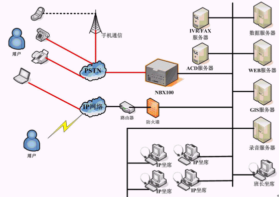 求助中心熱線系統(tǒng)采用華為-3COM 的 NBX100 網(wǎng)絡(luò)交換機作為呼叫接入設(shè)備,基于純IP交換技術(shù),座席電話全部采用IP話機,部署方式靈活。求助中心系統(tǒng)主要負(fù)責(zé)受理市民投訴,并派發(fā)到相關(guān)二級網(wǎng)絡(luò)單位;網(wǎng)絡(luò)單位系統(tǒng)主要負(fù)責(zé)處理中心下發(fā)的投訴單據(jù),并進(jìn)行反饋,同時,網(wǎng)絡(luò)單位也可自行受理投訴,并進(jìn)行相應(yīng)的上傳和下發(fā),多級網(wǎng)絡(luò)單位之間可實現(xiàn)級聯(lián)。為了簡化單據(jù)中轉(zhuǎn)流程,求助中心系統(tǒng)在網(wǎng)絡(luò)派單的基礎(chǔ)上,還結(jié)合自動傳真、短信群發(fā)等技術(shù),提供了自動傳真派單、自動短信派單等多種單據(jù)派發(fā)功能,極大的提高了單據(jù)處理效率。