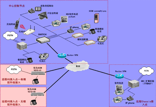 本方式遠端采用 HuaWei-3COM 的 VG 語音網關接入 PSTN ,并有兩種連接方式:遠端使用 VG10-40 和 VG10-41.