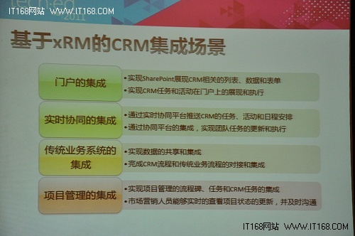 而基于xRM的CRM集成則包括門戶的集成、實(shí)時(shí)協(xié)同的集成、傳統(tǒng)業(yè)務(wù)系統(tǒng)的集成和項(xiàng)目管理的集成。